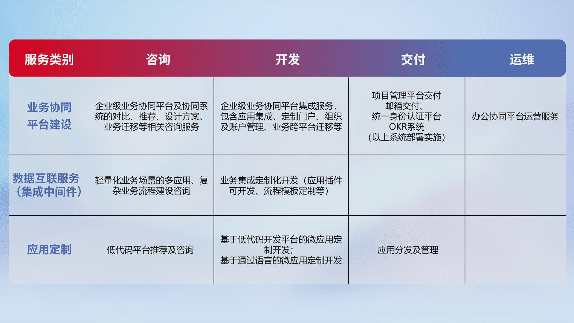 针对钉钉、、企微、、、IDaas等平台级产品提供产品的规划、、、、方案、、、、交付、、、、定制化开发等服务,,,,实现如统一协同办公、、、、智能客户服务、、、、混合会议管理、、智能数据查询、、、等业务场景,,,实现数字化转型。。。。
